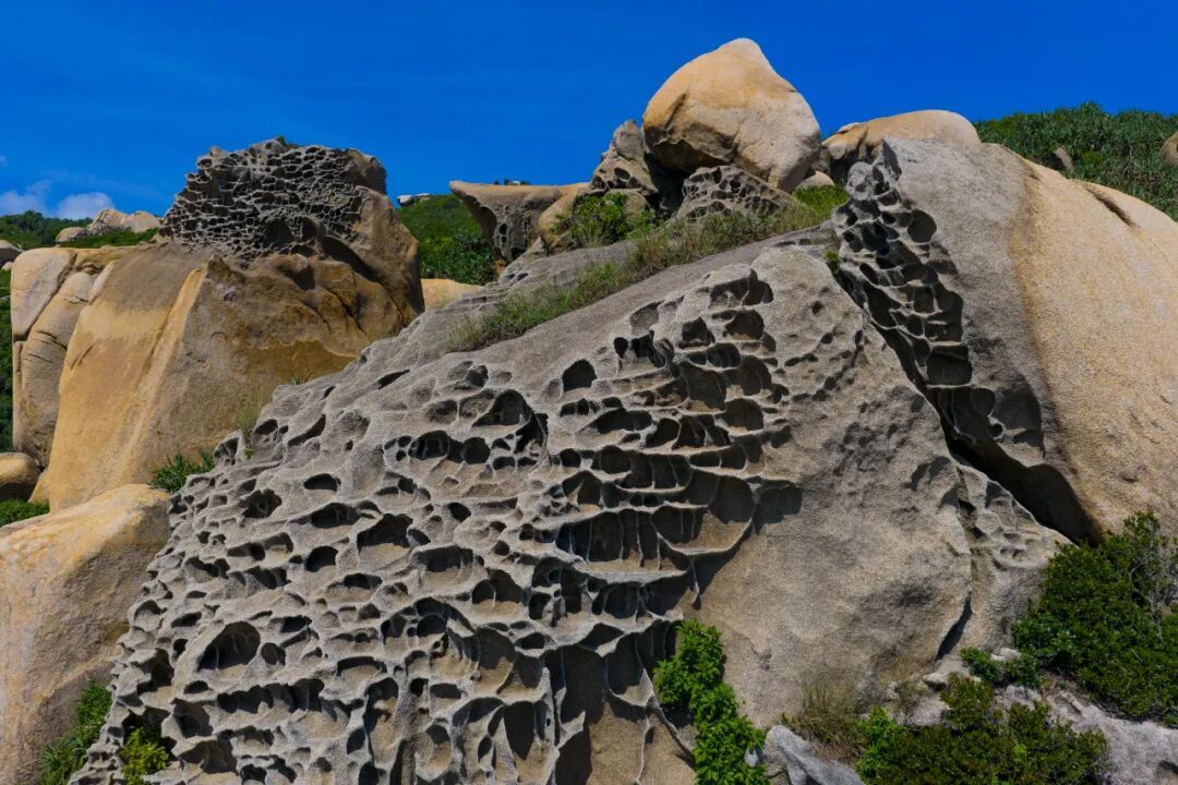 站在岩壁前,能想象出千万年来,咸湿的海风如何裹挟着尘埃、盐分和水汽,直扑海岛。海风一遍遍亲吻、抚摸甚至啃噬、打磨这些顽石,把它们雕刻成蜂窝状的肌理。海浪与时间在此合谋,将岩石雕琢成一片天然的“碑林”。