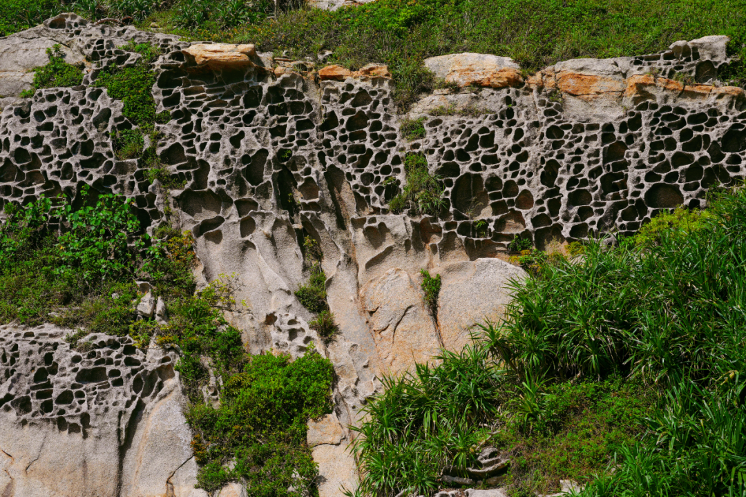这些岩石被海风与时间雕琢成不可思议的模样——整面岩壁上布满密密麻麻的孔洞,像大海留下的密码,又像岁月吐纳的气孔。石头的颜色也因为孔洞有了一条泾渭分明的界线:蜂窝状的部分已成了灰黑色,没被侵蚀的部分仍然保留着棕黄。