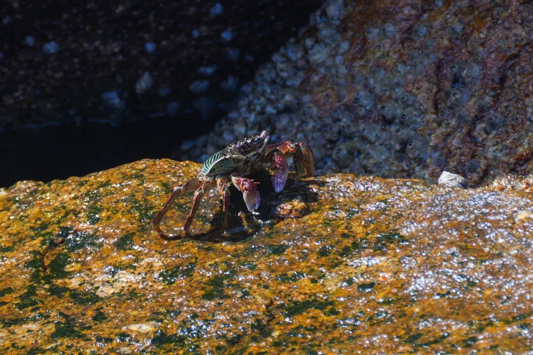 向岩石底下望去,密密麻麻的螺类牢牢地吸附住岩石,浪涛涌来时,水珠从螺壳间淅沥滴落,形成微型水帘洞般的奇观。