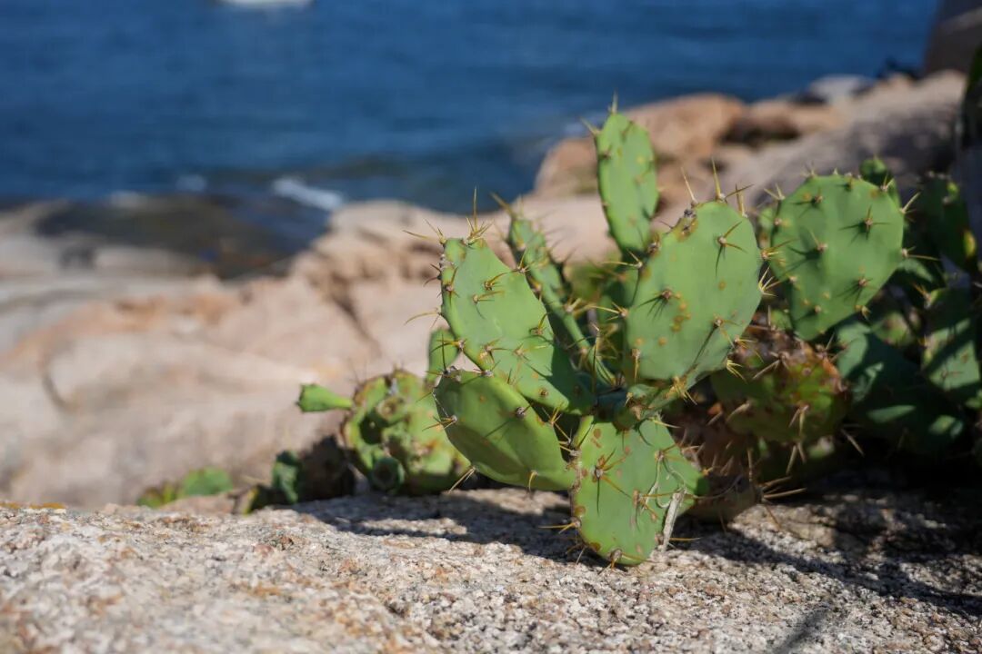 目光转向脚下的岛屿,岛岸的细节得以显现。在粗糙的灰色岩石上,一丛丛仙人掌顽强地扎根生长。它们肥厚的绿色茎叶和尖锐的黄刺,是适应多风、高盐海岛环境的证明。这些耐旱植物与礁石为伴,直面海风,展现出原始而坚韧的生命力。